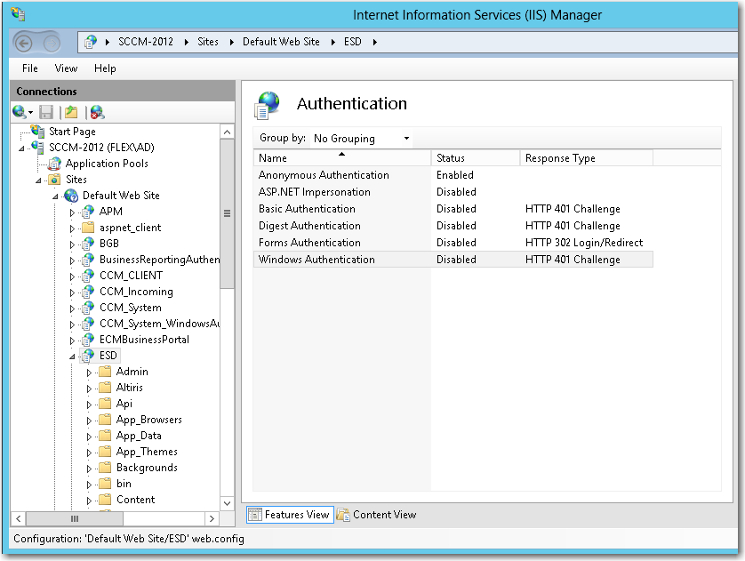 • To use single sign-on functionality, make sure that anonymous authentication is enabled in IIS for the ESD site and that Windows Authentication is disabled.