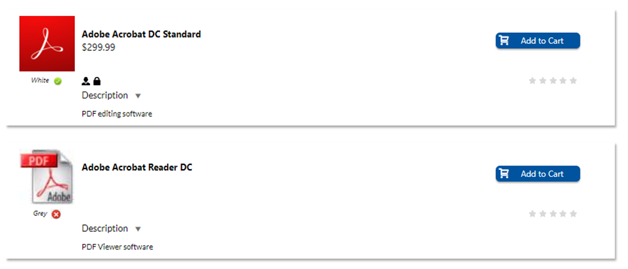 In the image above, Adobe Acrobat DC Standard is classified as White which is a Preferred type. Adobe Acrobat Reader DC is classified as Grey which is Non-Preferred type. An alert message is displayed with options to choose alternates when users click Add to Cart for a Non-Preferred catalog. This is only when the Add to Cart button is clicked, not when the Install Now button is clicked.