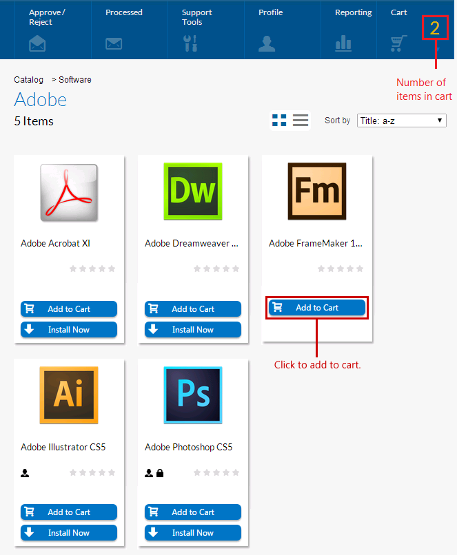 - Once you locate the item, begin the checkout process by clicking the Add to Cart button in the catalog item card. When an item is added to the shopping cart, the cart count will increase.