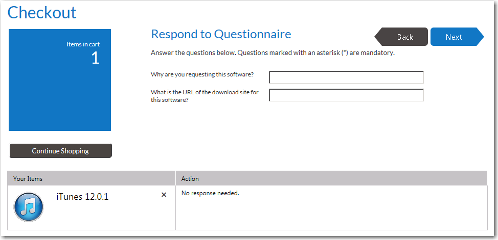 - If the questions are associated with all of the catalog items in your cart, the questions will be listed at the top of the screen. If the questions pertain to a specific catalog item, the questions will be listed in the table below next to the catalog item.